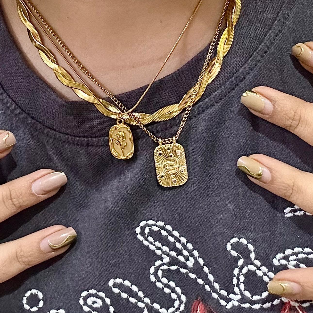Kishara’s HERRINGBONE SNAKE NECKLACE STACK which is Anti tarnish , waterproof and for everyday wear.